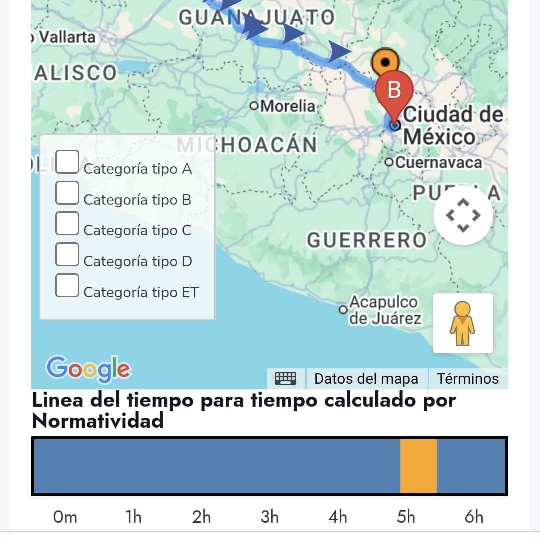 Mapp brinda información de descansos en cada ruta considerando la NOM-087. Muestra los puntos donde se debe descansar media hora, y descansar 8 horas de forma automática sin importar lo largo de la ruta.