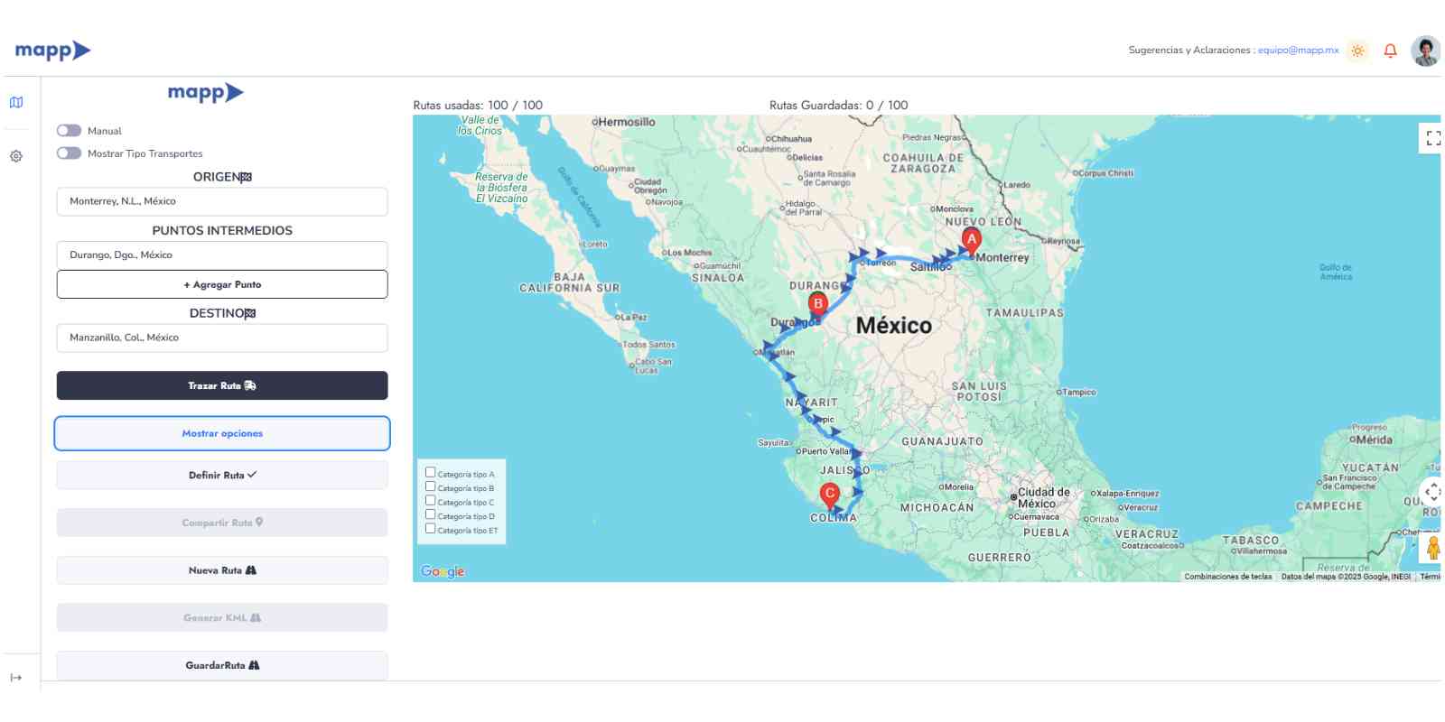 Calcula costos de ruta, casetas de peaje, arrastra tus rutas,
